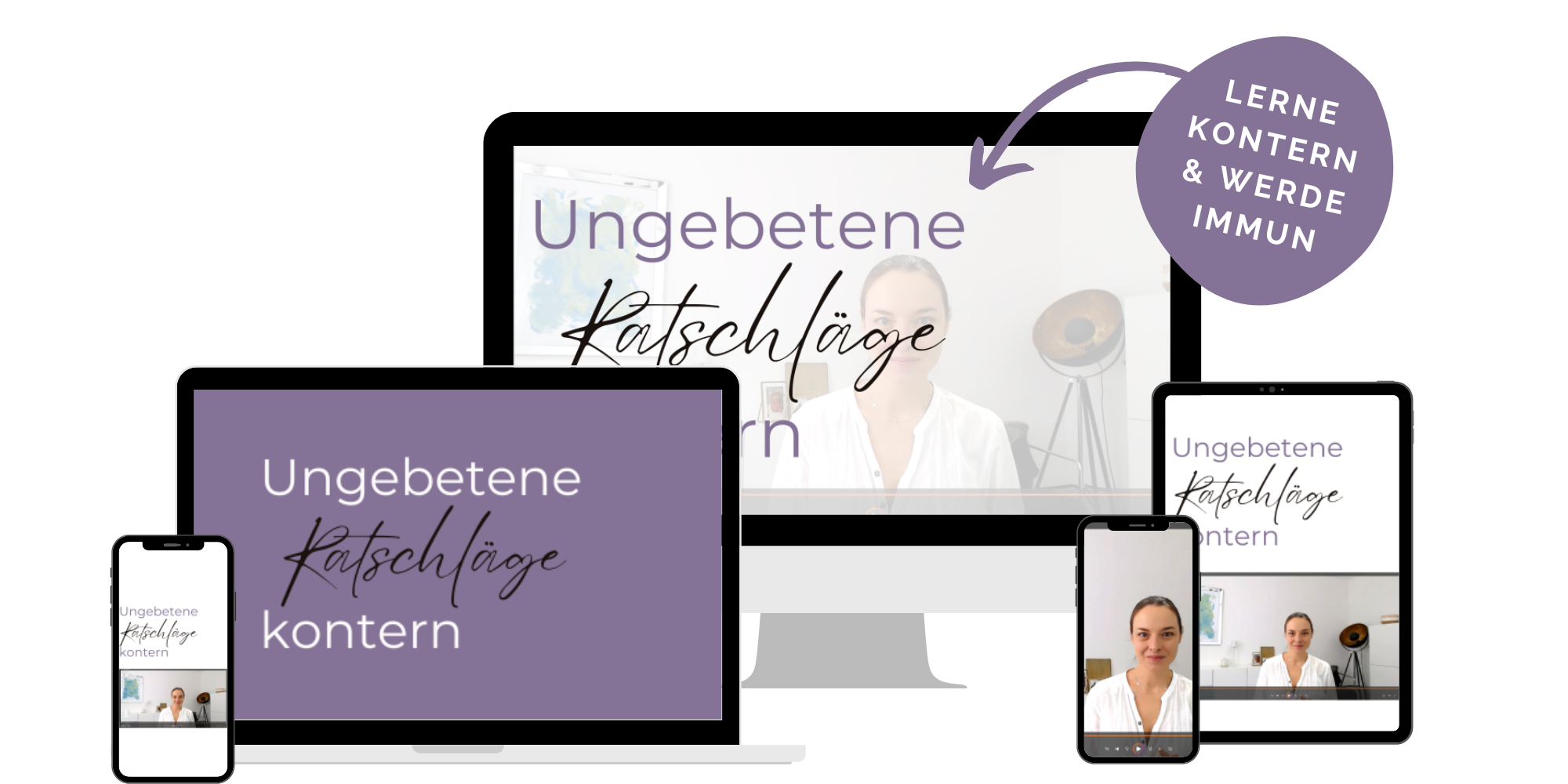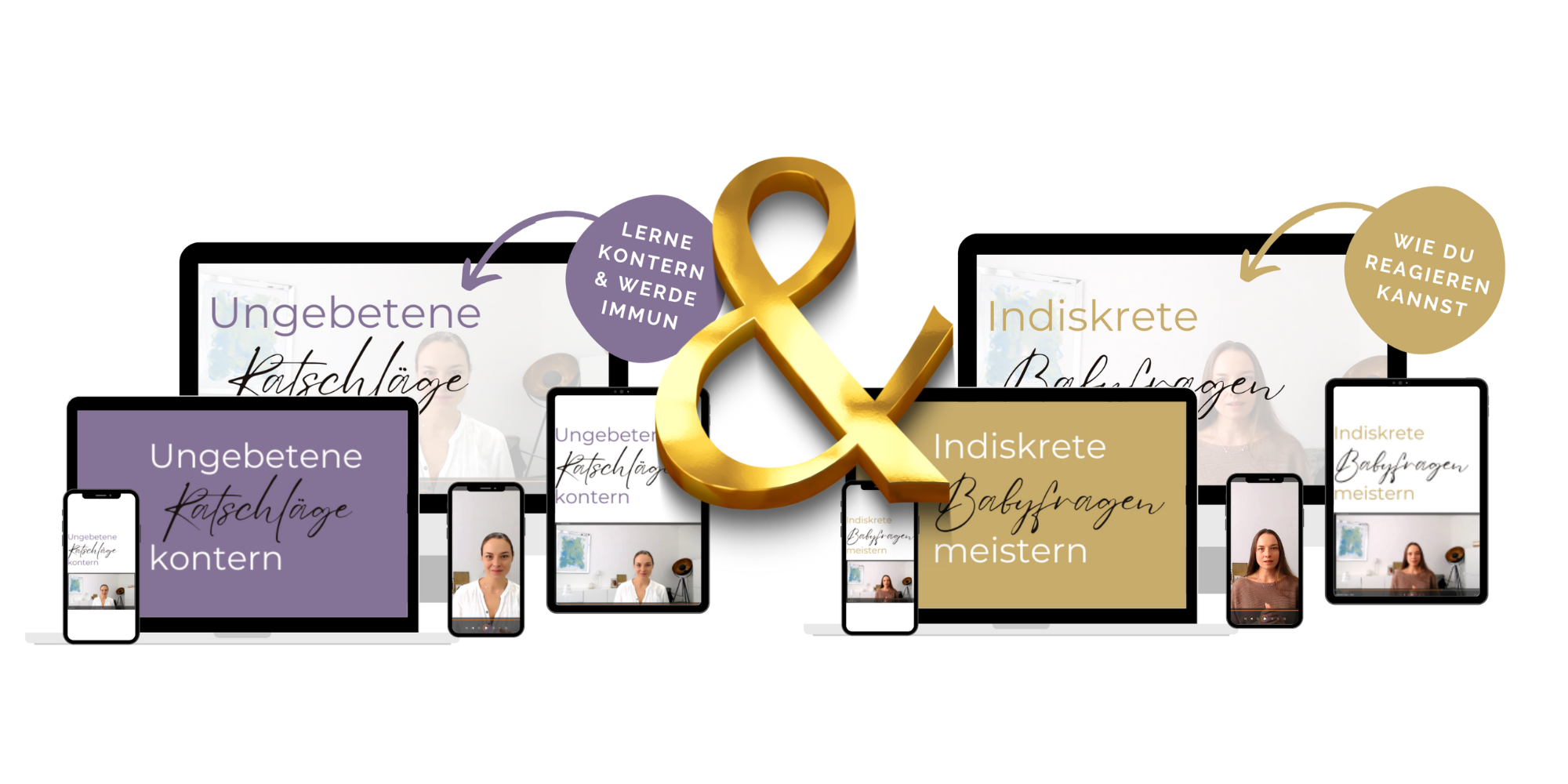 "Ungebetene Ratschläge kontern" und "Indiskrete Babyfragen meistern" sind zwei Videotrainings, in denen du lernst, wie du mit den gängigsten Ratschlägen, die frau in der Kinderwunschzeit zu hören bekommt, umgehen kannst, damit du ein für allemal Ruhe hast.
